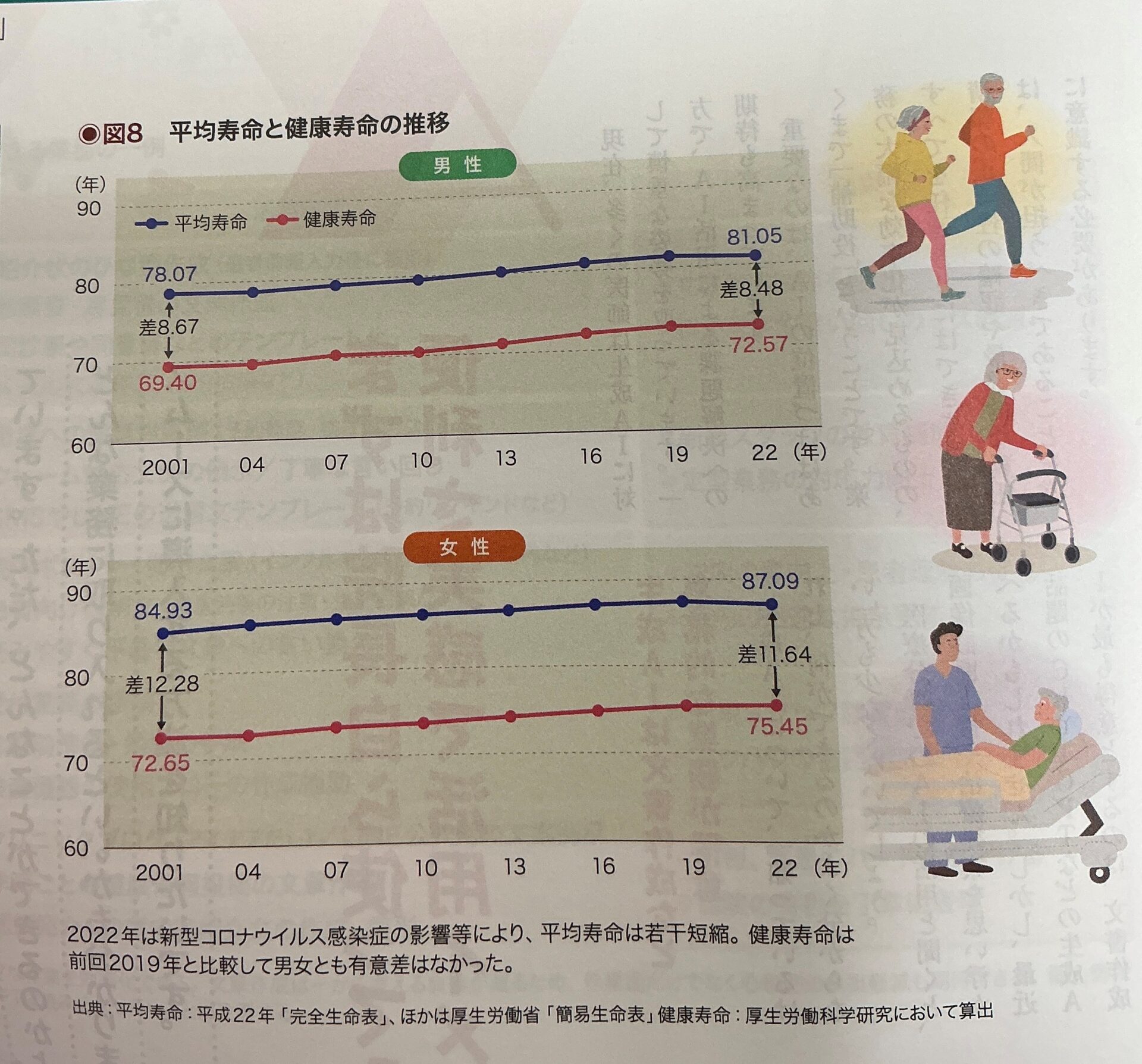 私たち日本人の平均寿命は年々のびていますが、実は「元気で生活できる年齢=健康寿命」との間にはまだ差があります。男性で8.46年 女性で11.64年。
