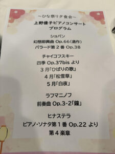 フレデリック・ショパン や ピョートル・チャイコフスキー などのクラシックの曲が演奏され、穏やかな雰囲気の中で会が進みました。